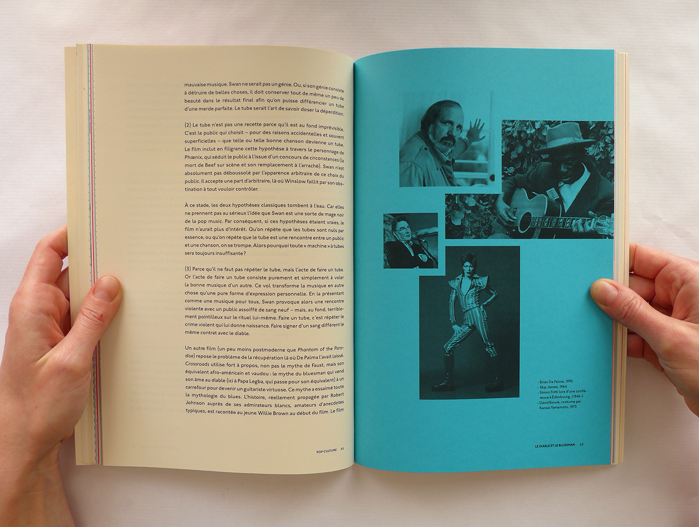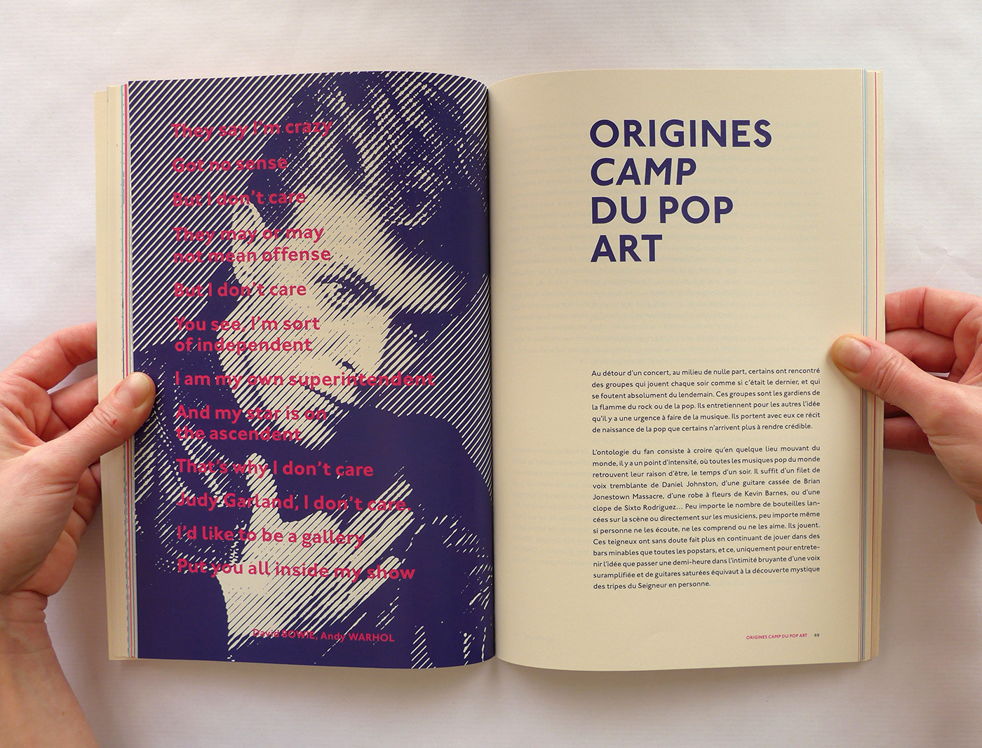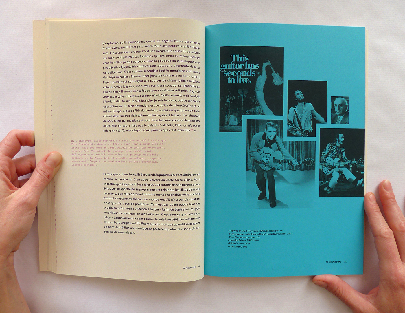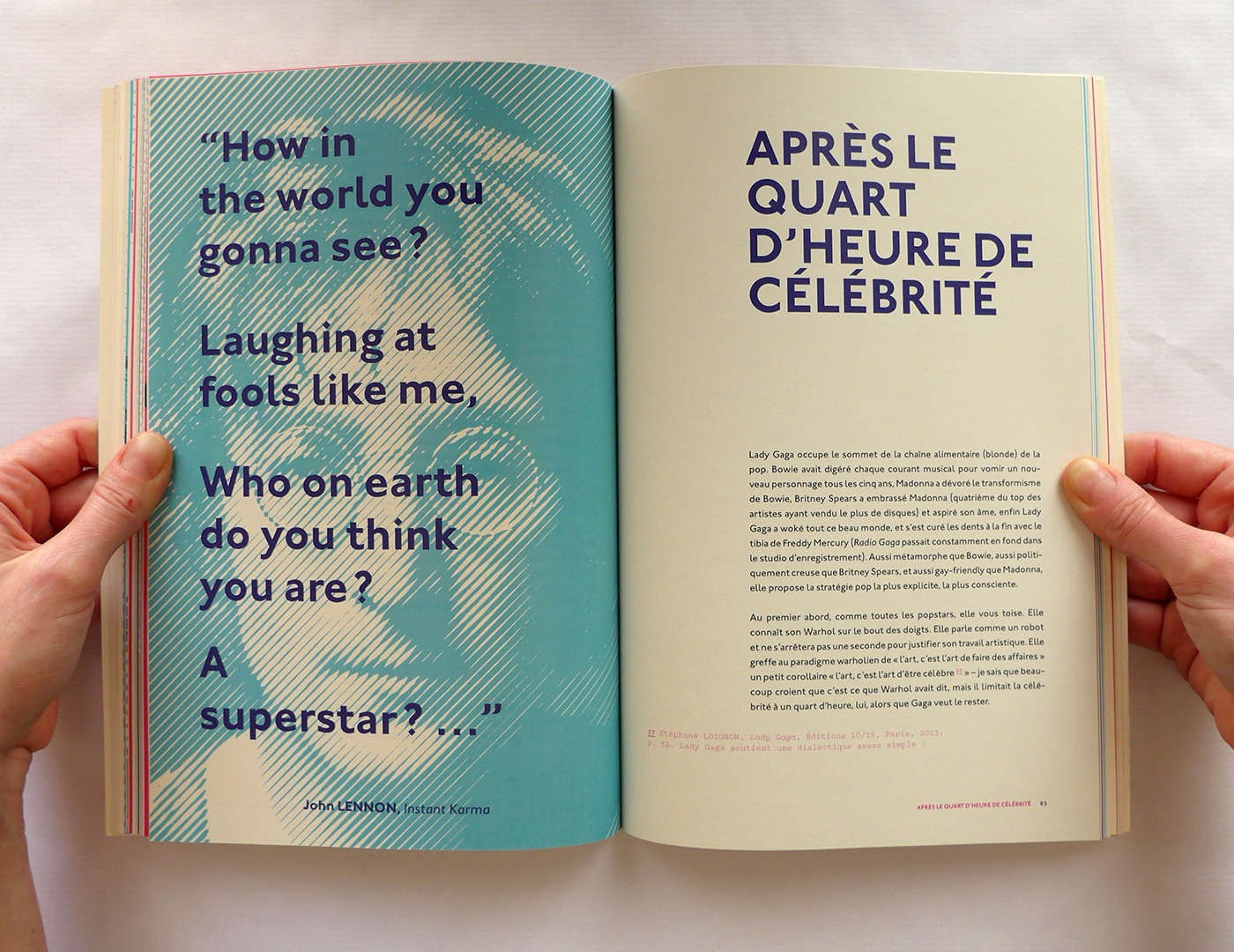 Pour cette édition sur les thèmes de la Pop Culture et de la musique, j’ai repris le format populaire du magazine. Ensuite, j’ai utilisé la typographie Johnston (1916), icône du métro londonien, à la fois dans l’édition et la page web associée. Enfin, la lecture du livre est rythmée par des pages colorées et des photos noir et blanc en pleine page qui ouvrent et ferment chaque chapitre. Ainsi que des notes décalées et colorées, en Pitch (police de caractère).
