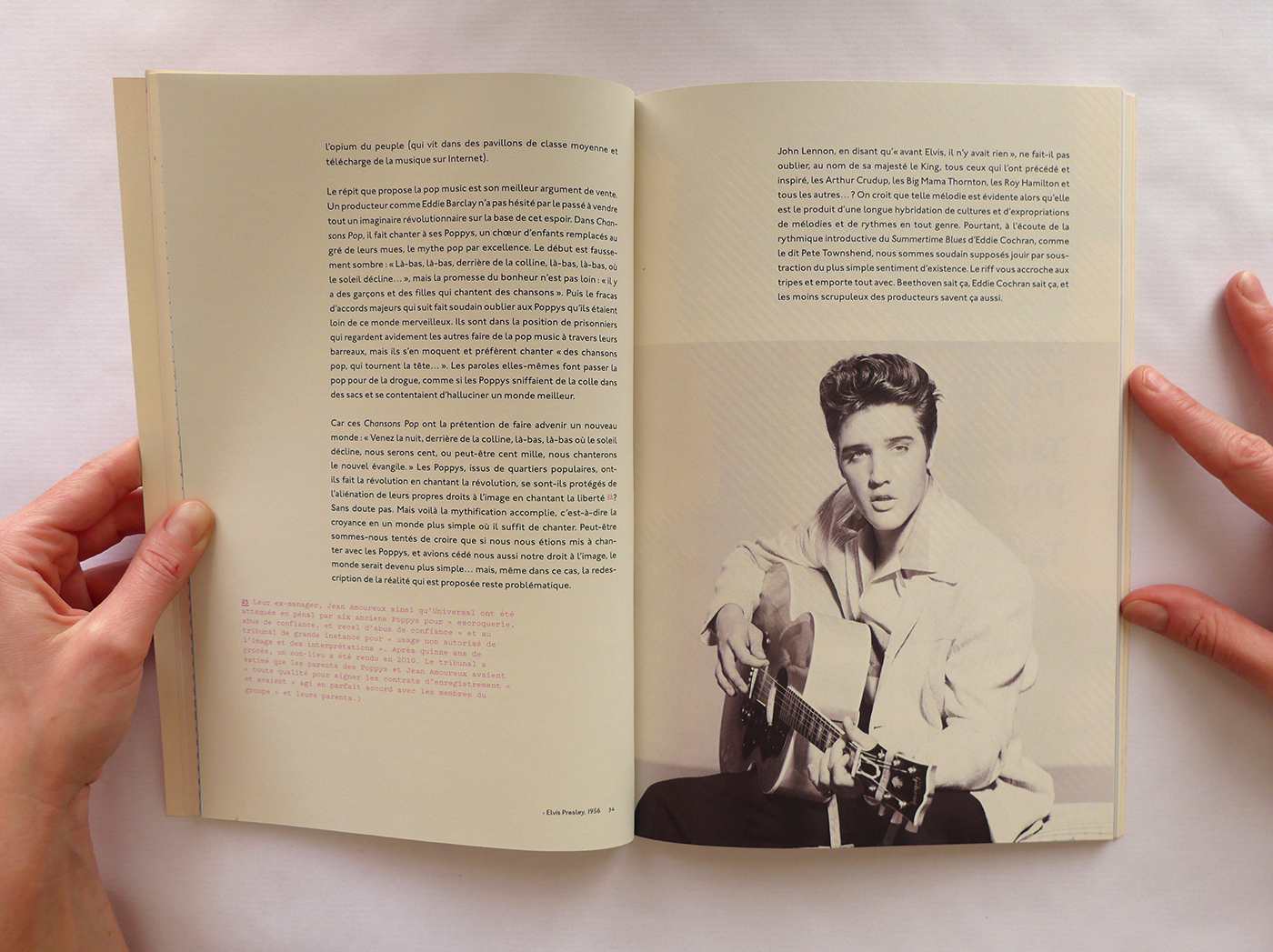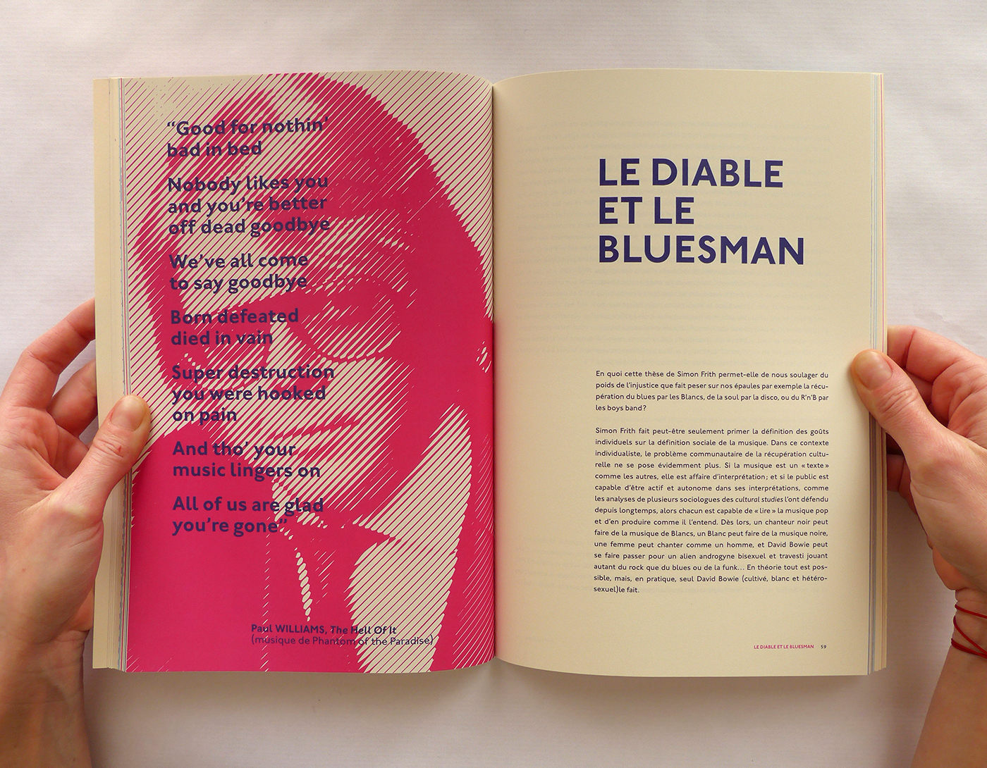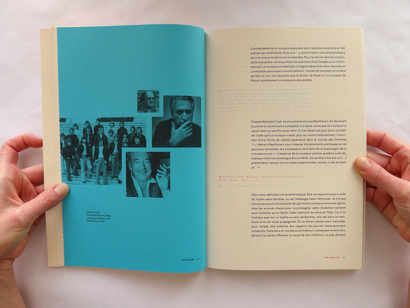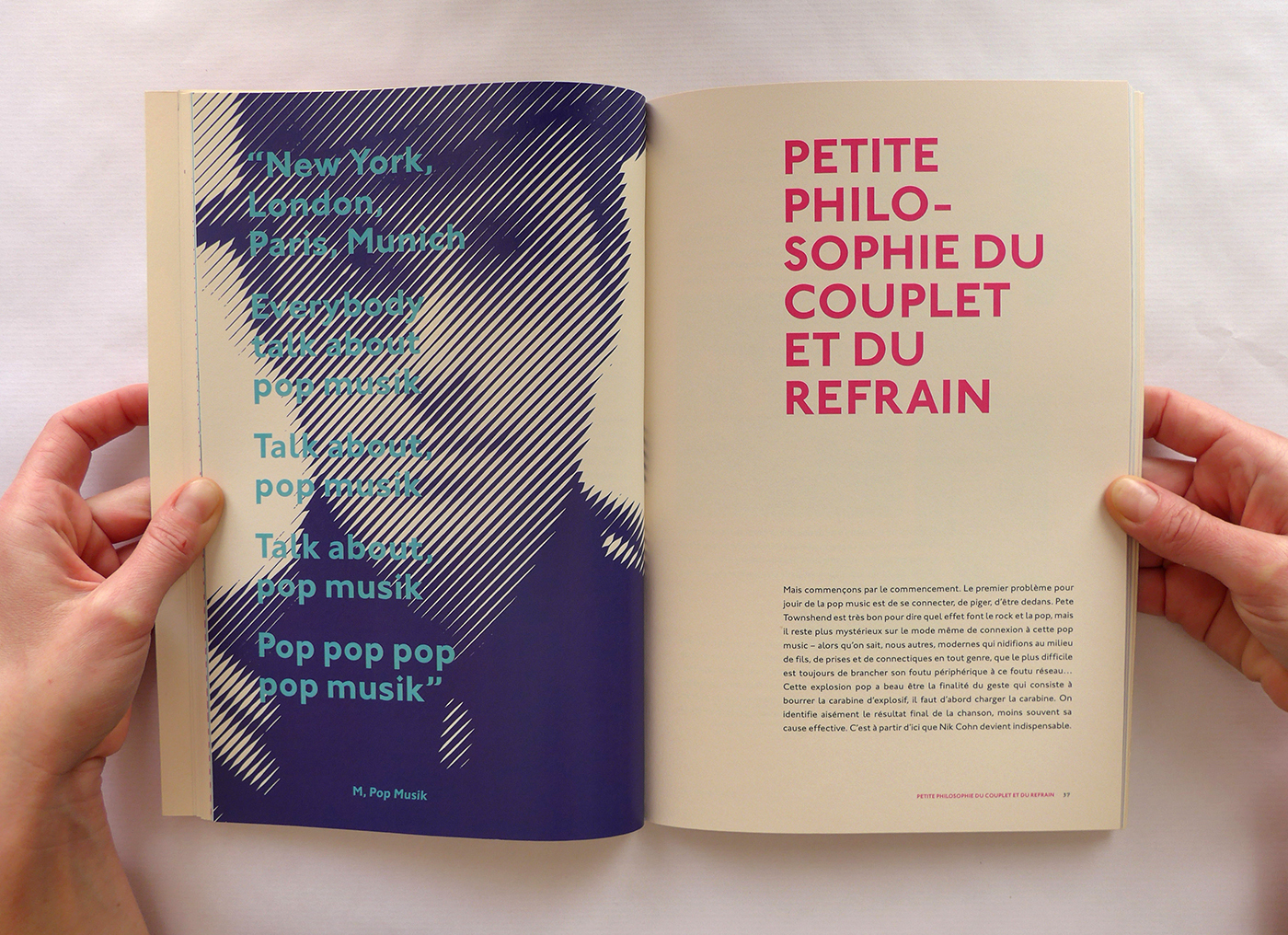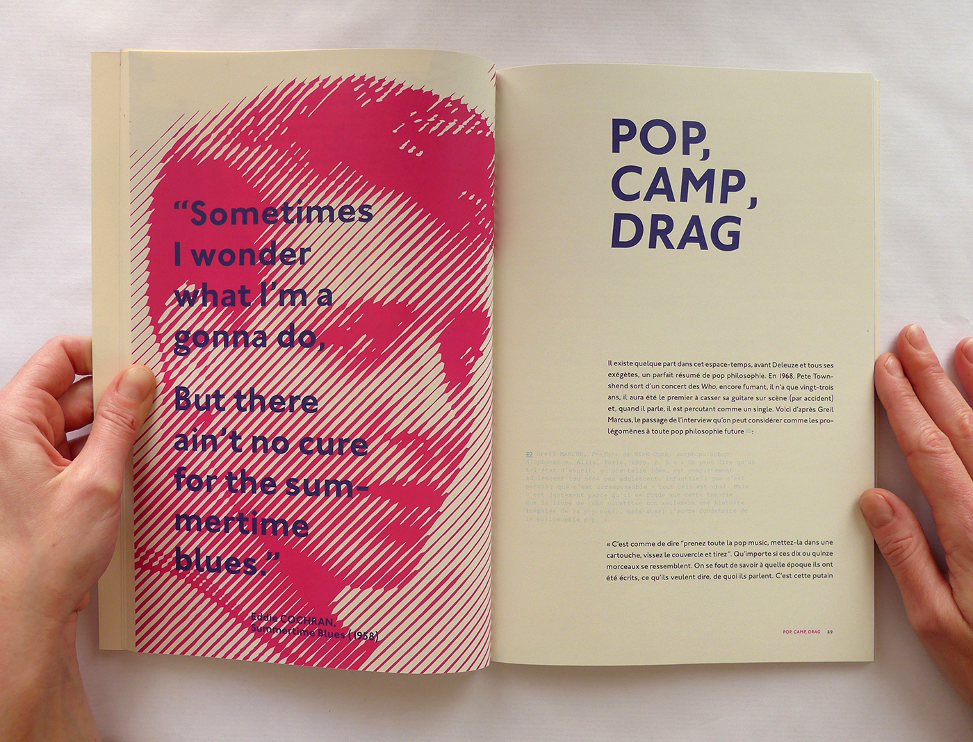 Pour cette édition sur les thèmes de la Pop Culture et de la musique, j’ai repris le format populaire du magazine. Ensuite, j’ai utilisé la typographie Johnston (1916), icône du métro londonien, à la fois dans l’édition et la page web associée. Enfin, la lecture du livre est rythmée par des pages colorées et des photos noir et blanc en pleine page qui ouvrent et ferment chaque chapitre. Ainsi que des notes décalées et colorées, en Pitch (police de caractère).